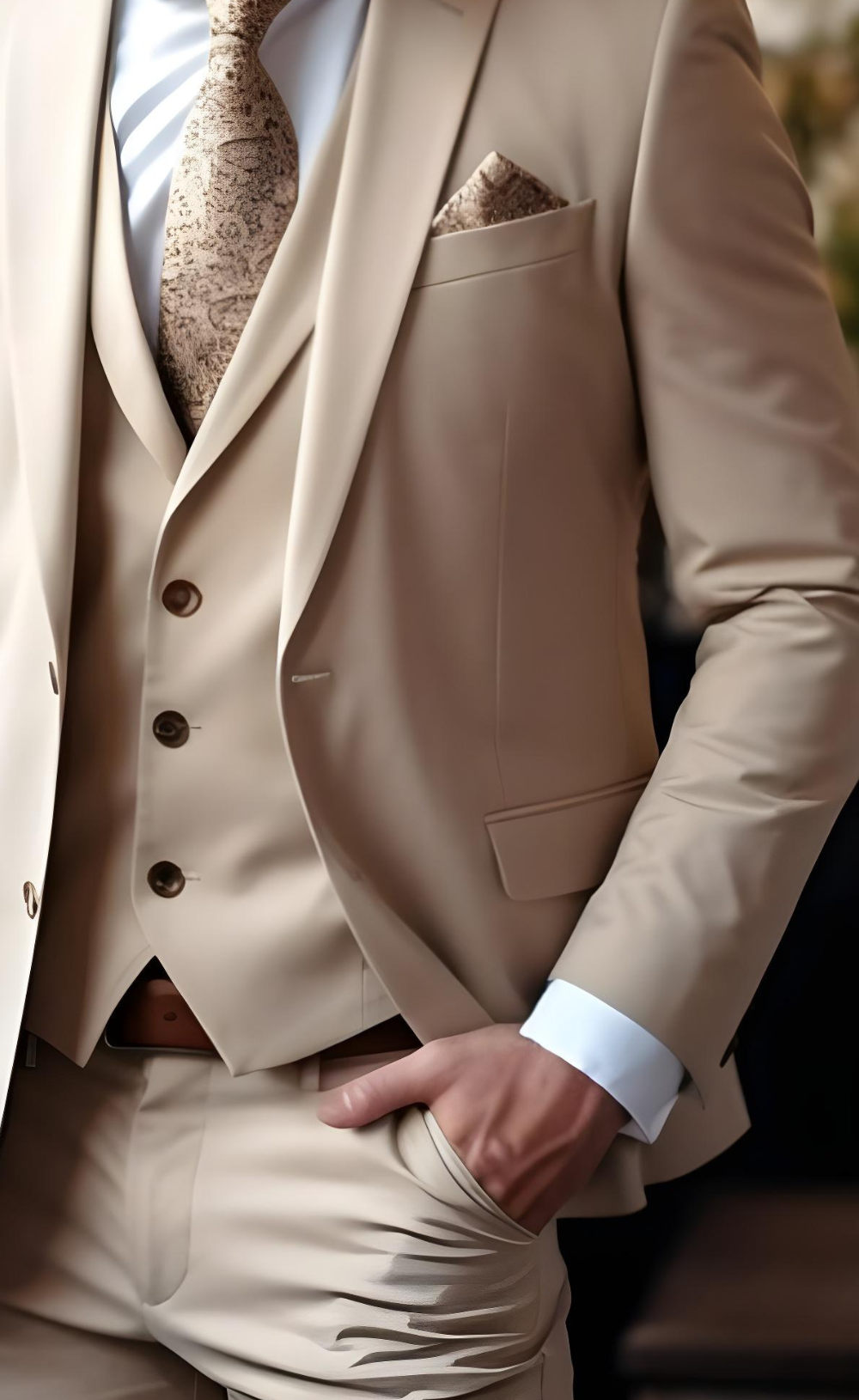 Crafted from high-quality materials, this beige three-piece suit exudes both comfort and confidence. The versatile color allows for effortless pairing with a range of shirts and accessories, making it an essential addition to your collection.