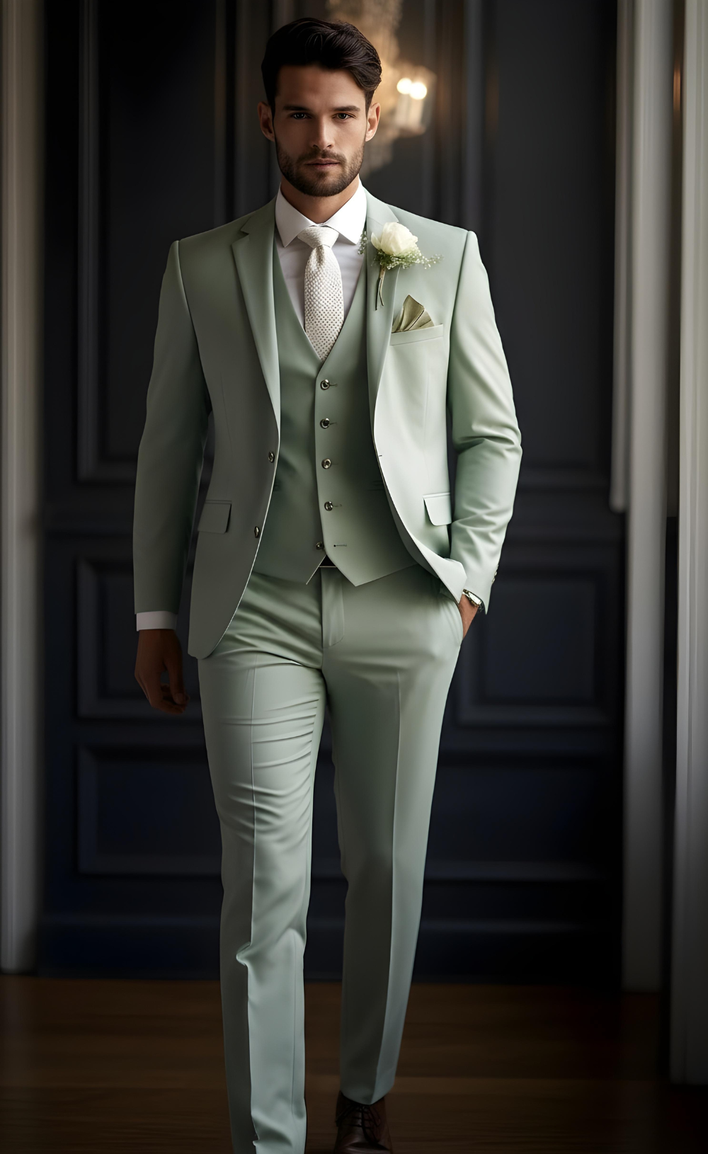 Elevate your style with our handcrafted Sage Green Three-Piece Suit for men. Crafted with the utmost attention to detail, this sophisticated suit exudes charm and elegance for any formal occasion. The set includes a tailored jacket, vest, and trousers, making it the perfect choice for weddings, business meetings, or special events.