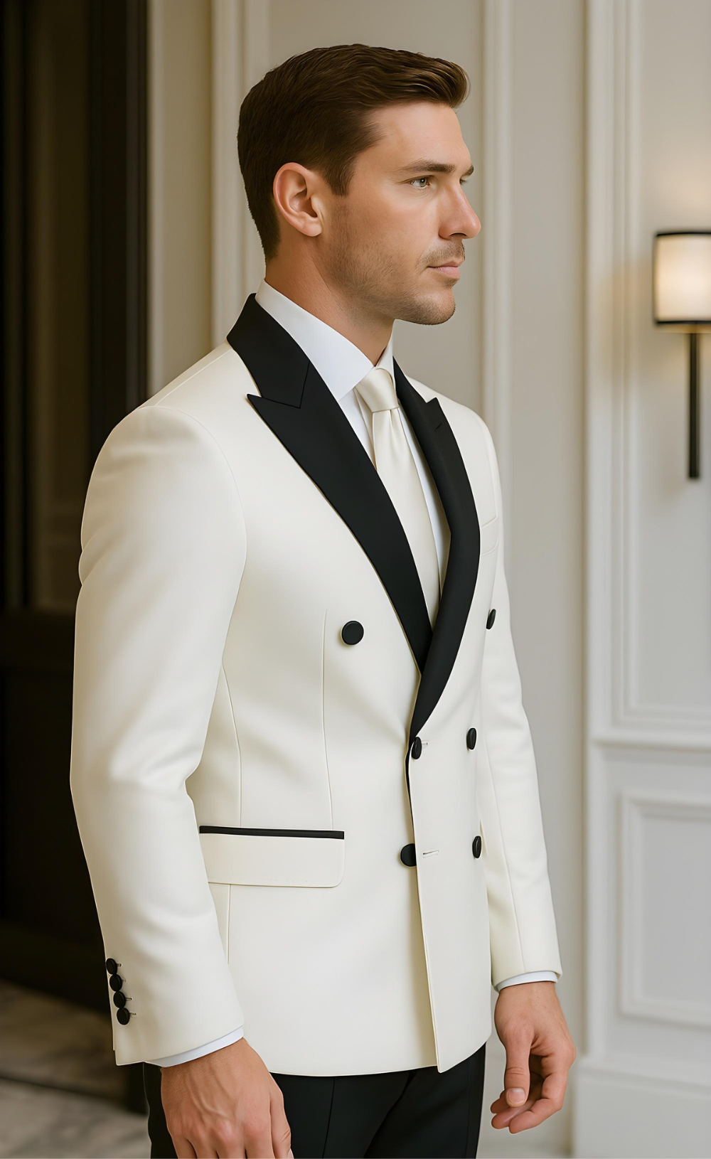 Experience the perfect blend of elegance and modernity with our White Double Breasted Tuxedo with Black Satin Lapels. This suit is ideal for both weddings and business events, designed to make a bold statement while exuding timeless sophistication. Crafted from high-quality fabric, this tuxedo ensures superior comfort and durability, making you look sharp and feel confident all day long.