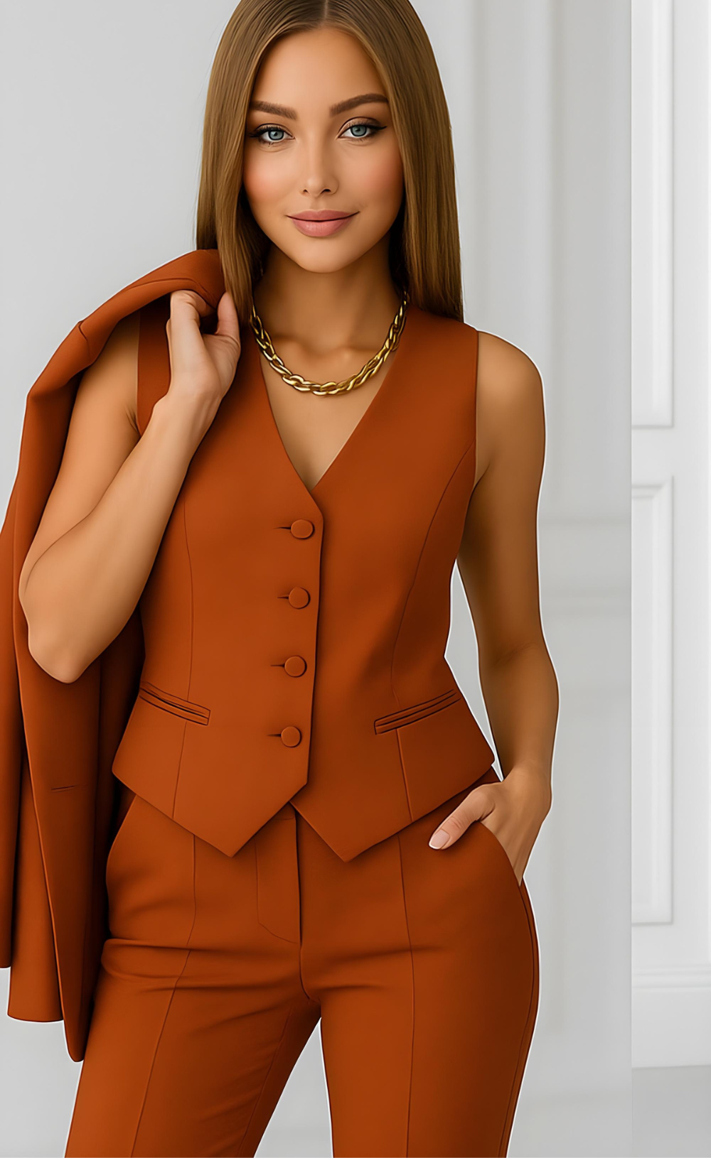 Command every room in our Burnt Orange Three-Piece Women’s Suit, a stunning blend of tailored precision and fearless elegance. This set features a sharp single-breasted blazer, a structured 5-button vest, and slim-fit trousers—all crafted from premium suiting fabric with a smooth drape and a rich, statement-making hue.
